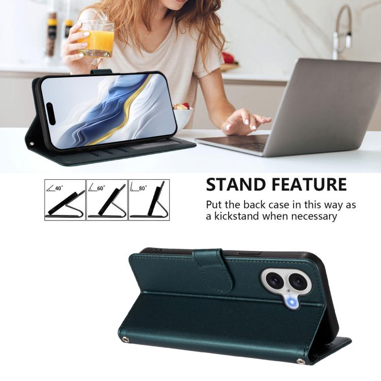Funda de piel con diseño de gato y corazón en relieve para iPhone 17 con correa de mano (verde oscuro)