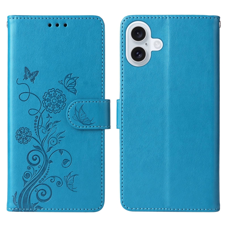 Funda de Piel para iPhone 16 con Diseño de Mariposas y Flores en Relieve (Azul)
