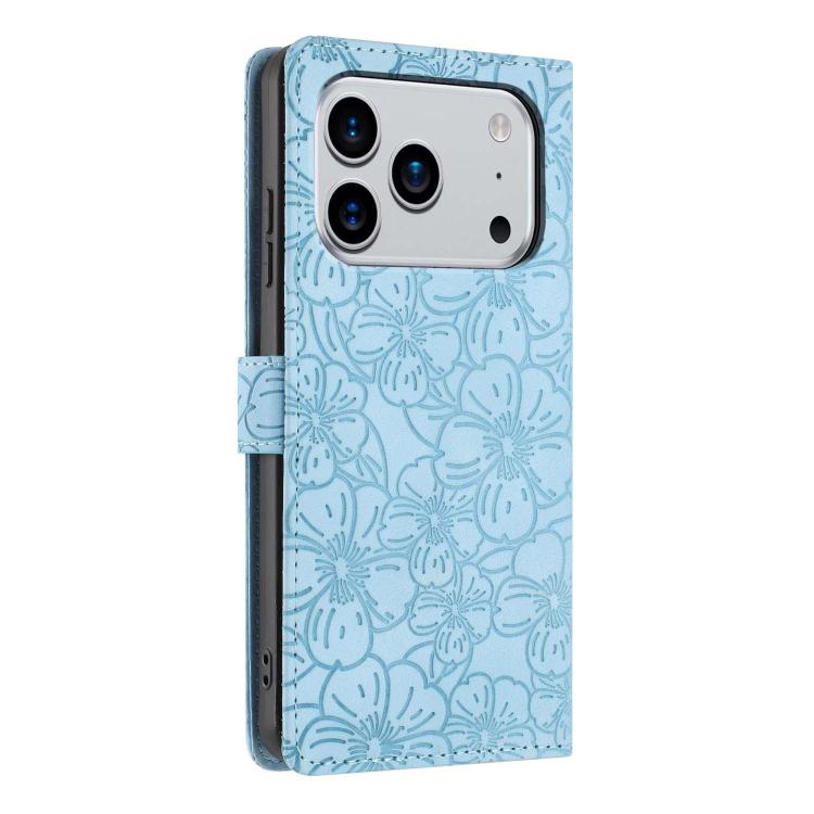 Funda de piel con relieve de flores de cerezo para iPhone 17 Pro (azul claro)