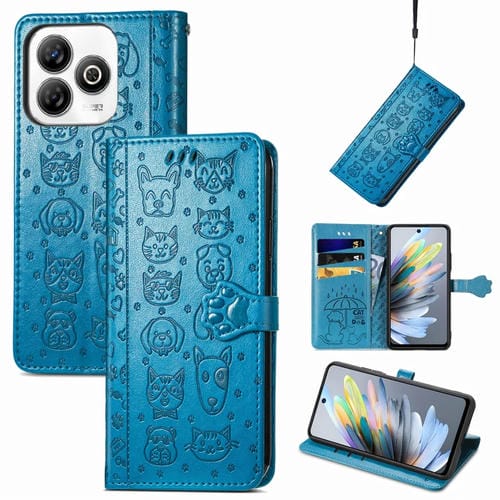 Funda de Piel con Relieve de Gato y Perro para ZTE Blade A75 4G (Azul)