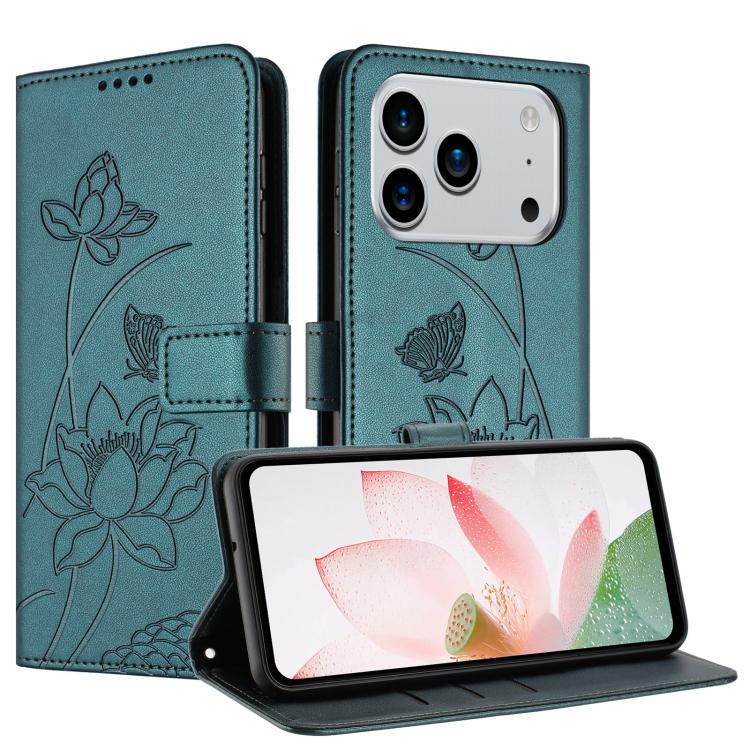 Funda de piel con relieve de loto para iPhone 17 Pro Max con cordón (verde oscuro)