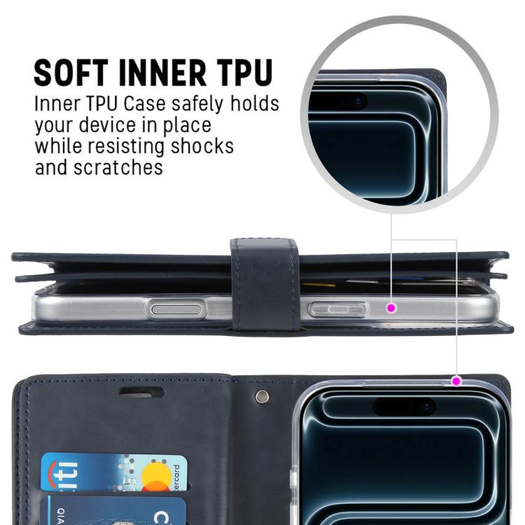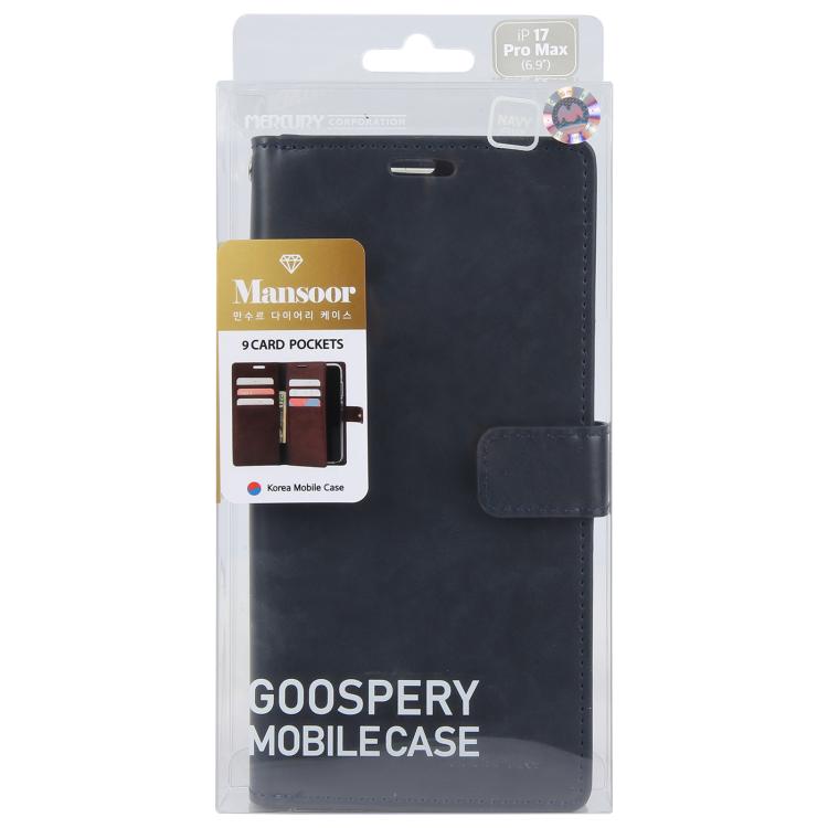 Funda de piel GOOSPERY MANSOOR DIARY para iPhone 17 Pro Max con 9 ranuras para tarjetas (Azul oscuro)
