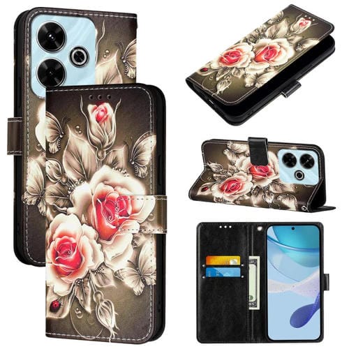 Funda de Teléfono de Cuero con Patrón de Dibujo de Colores de Tejido Liso para Xiaomi Redmi 13 4G (Rosas Sobre Negro)