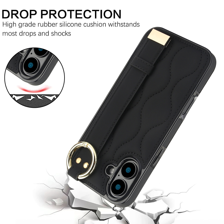 Funda de Teléfono Pu para iPhone 16 con Anillo Cobertura Total Antideslizante con Pulsera (Negra)
