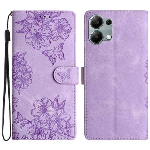 Funda de Teléfono de Pu con Relieve de Piel de Mariposa y Diseño de Flor de Cerezo para Redmi Note 13 Pro 4G (Morado)