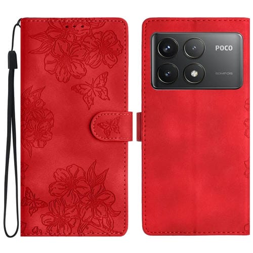 Funda de Teléfono de Pu con Relieve de Piel de Mariposa y Diseño de Flor de Cerezo para Xiaomi Poco F6 Pro (Rojo)