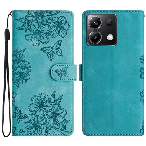 Funda de Teléfono de Pu con Relieve de Piel de Mariposa y Diseño de Flor de Cerezo para Xiaomi Poco X6 (Verde)