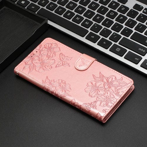 Funda de teléfono PU iPhone 12 Pro Max Relieve Mariposa y Flor de Cerezo (Oro Rosa)