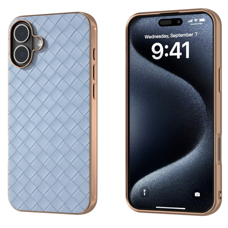 Funda de teléfono PU con textura tejida y marco galvanizado para iPhone 16 (Azul Claro)