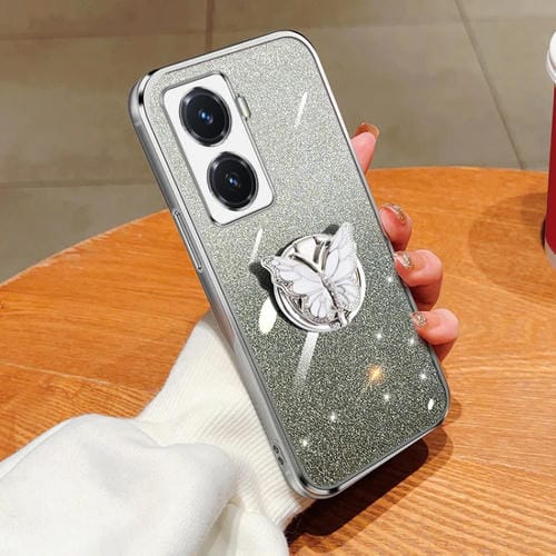 Funda de Teléfono de TPU con Soporte de Mariposa con Purpurina Degradada Plateada para Vivo Y77 5G (Plateada)