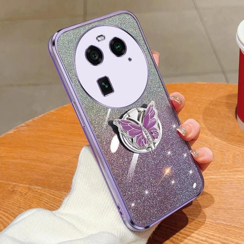Funda de TPU para Teléfono con Soporte de Mariposa con Purpurina Degradada Chapada para Oppo Find X6 (Morado)