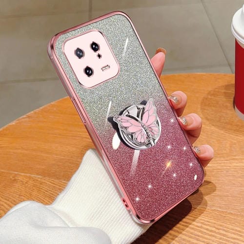Funda de TPU para Teléfono con Soporte de Mariposa con Purpurina Degradada Chapada para Xiaomi 13 (Rosa)