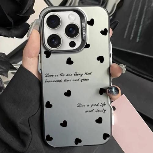 Funda híbrida TPU para iPhone 15 Pro Max con pintura plateada (Corazones de amor negros)