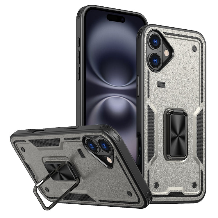 Funda híbrida TPU y PC con soporte anillo para iPhone 16 (Gris Titanio)