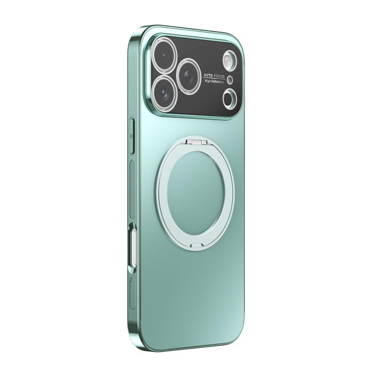 Funda MagSafe electrochapada para iPhone 17 Pro Max con soporte giratorio de 360 grados y cubierta para lente (verde claro).