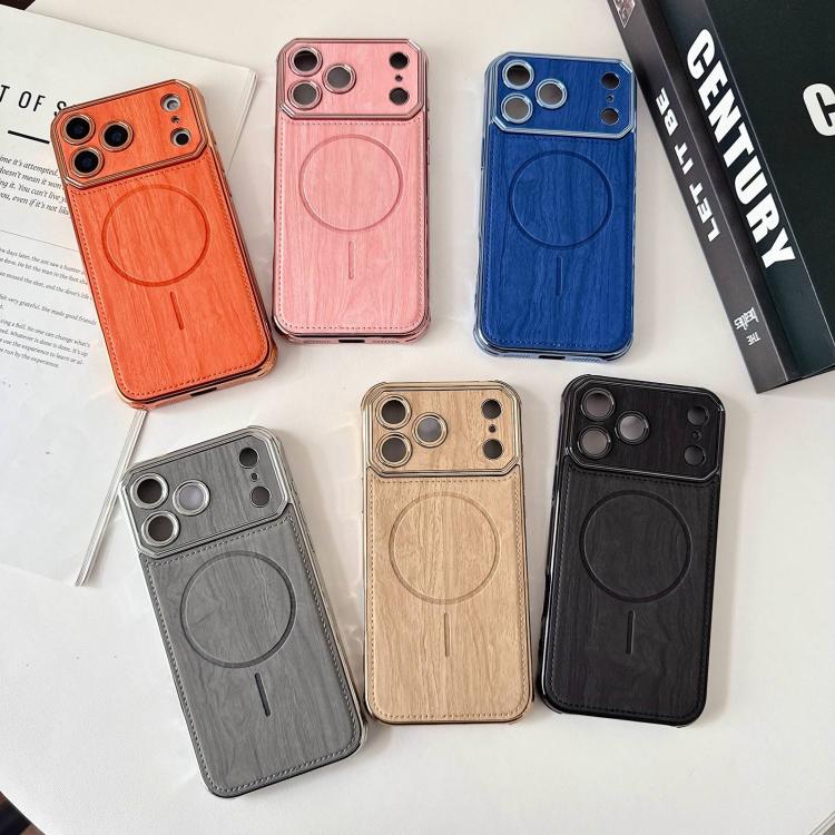 Funda MagSafe para iPhone 17 Pro Max con ventana grande de TPU, galvanizada, con textura de madera y película para lente (naranja)