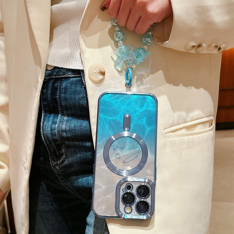 Funda para iPhone 16 Purpurina Degradado Plumas Doble Amor con Magsafe (Azul)