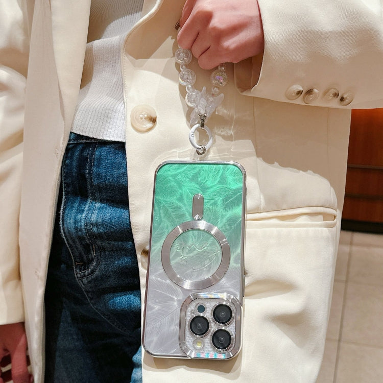 Funda para iPhone 16 Purpurina Degradado Plumas Doble Amor con Magsafe (Verde)