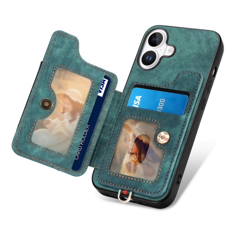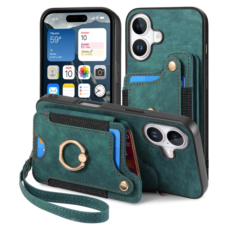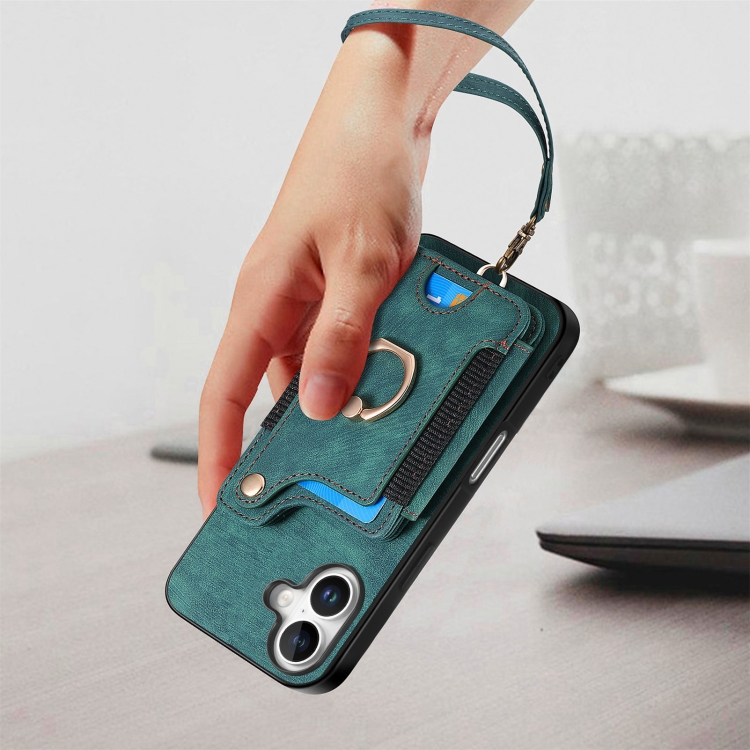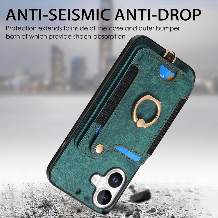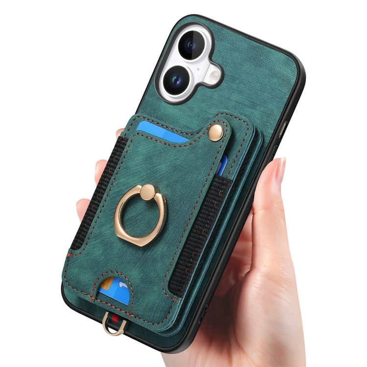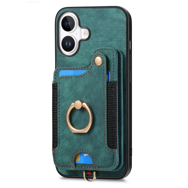Funda para Teléfono iPhone 16 Billetera MultiTarjeta Diseño Retro Piel Sintética Anillo (Verde)