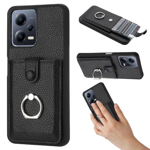 Funda para Teléfono con Diseño de Textura de Lichi y TaRJetero con Anillo para Redmi Note 12 5G (Negra)