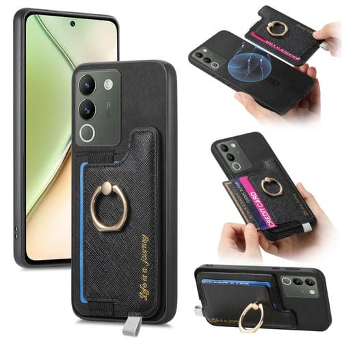 Funda para Teléfono con TaRJetero y Anillo de Cuero con Diseño Retro Magsafe Cross para Vivo Y200/V29E (Negro)