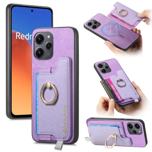 Funda para Teléfono con TaRJetero y Anillo de Cuero con Diseño Retro Magsafe para Redmi 12/Note 12R/Poco M6 Pro 5G (Morado)