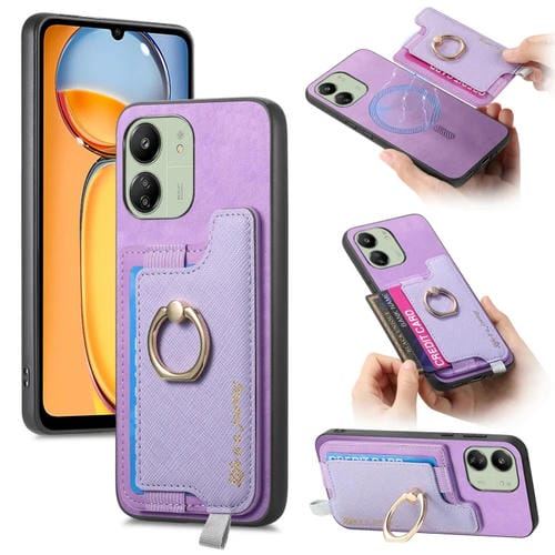 Funda para Teléfono con TaRJetero y Anillo de Cuero con Diseño Retro Magsafe para Redmi 13C / Poco C65 / M6 (Morado)