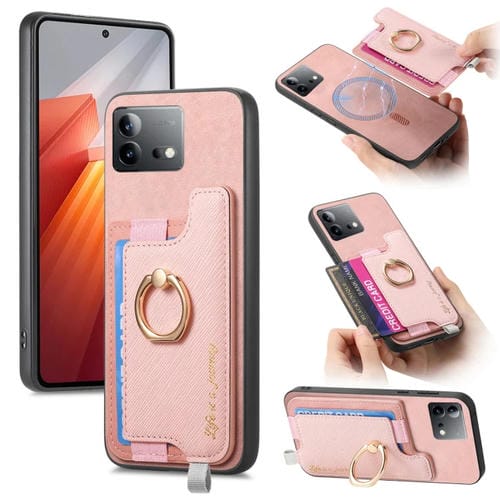 Funda para Teléfono con TaRJetero y Anillo de Cuero con Diseño Retro Magsafe para Vivo Iqoo Neo8/Neo8 Pro (Rosa)