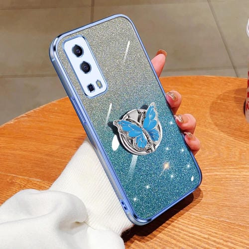 Funda para Teléfono de TPU con Soporte de Mariposa con Purpurina Degradada Chapada para Vivo Y72 5G / Iqoo Z3 5G (Azul Sierra)