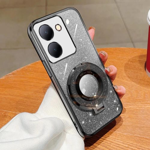 Gradient Glitter Plating Round Holder TPU Phone Case for vivo Y78/Y36 5G(Black)