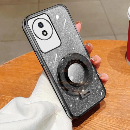 Funda para Teléfono de TPU con Soporte Redondo y Purpurina Degradada Plateada para Vivo Y02/Y11 2023 (Negra)