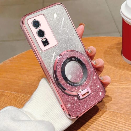 Funda para Teléfono de TPU con Soporte Redondo y Purpurina Degradada Plateada para Vivo Y76S (Rosa)