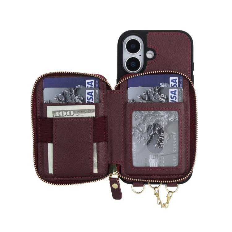 Funda tipo cartera bandolera con cremallera AwQuer 2 en 1 para iPhone 17, con parte trasera de cuero (rojo vino).