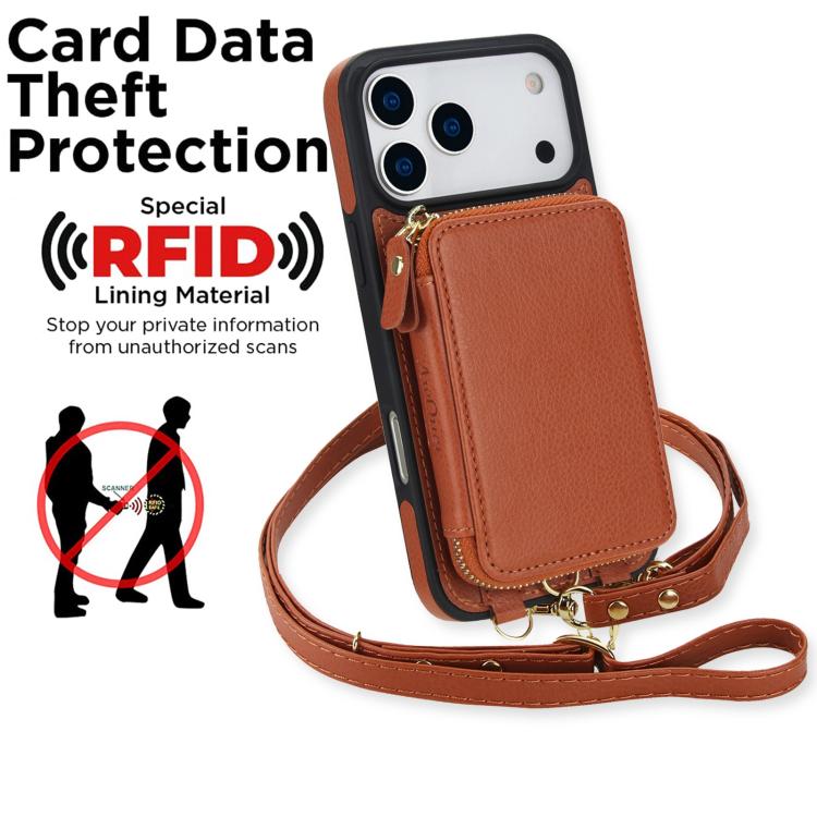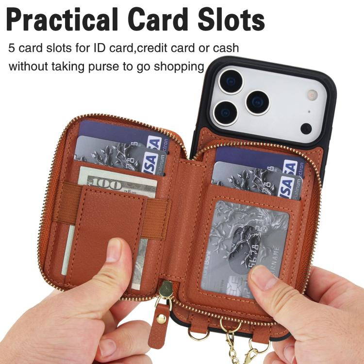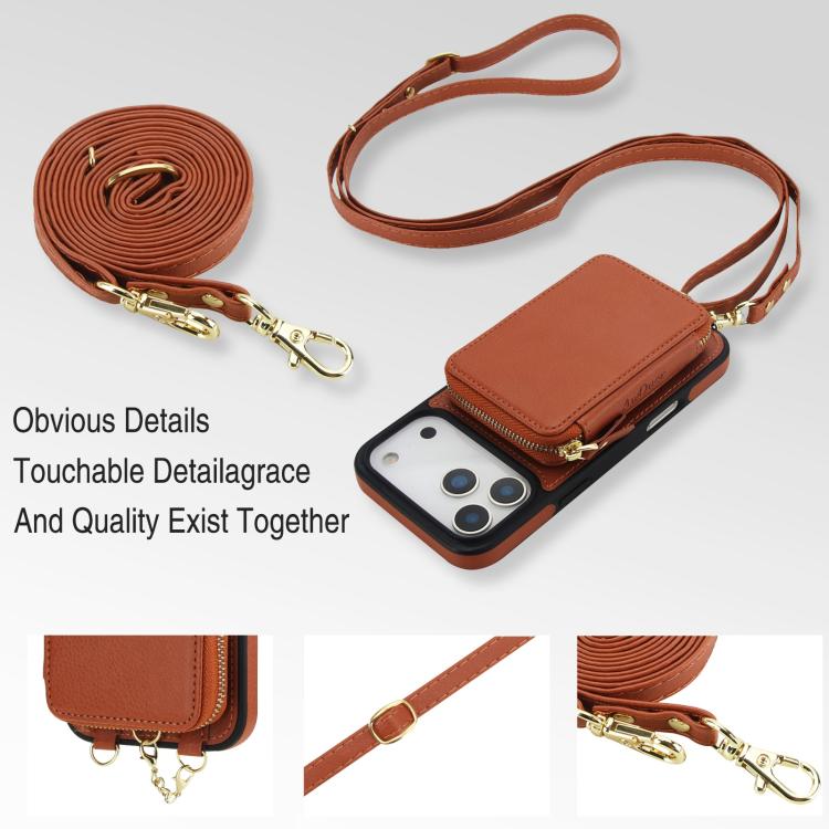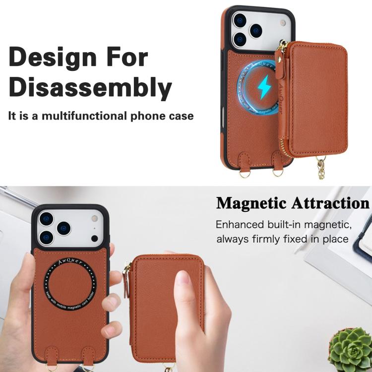 Funda tipo cartera bandolera con cremallera AwQuer 2 en 1 para iPhone 17 Pro con parte trasera de cuero (marrón)