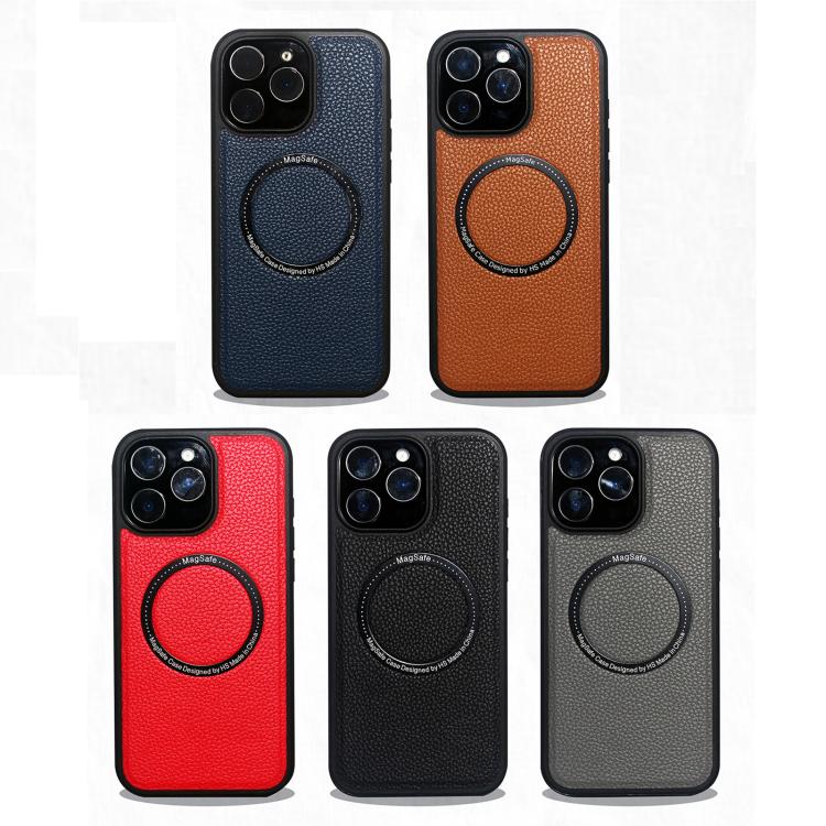 Funda trasera MagSafe de PU con textura de lichi para iPhone 16 (gris)