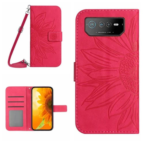 Funda de Cuero con Tapa y Cordón para Asus Rog Phone 6 Pro Skin Feel Sun Flower Pattern (Rose Red)