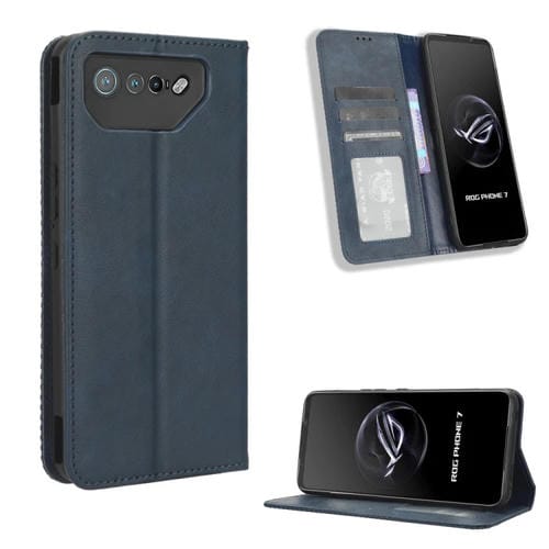 Funda de Cuero para Asus Rog Phone 7 con Hebilla Magnética y Textura Retro (Azul)