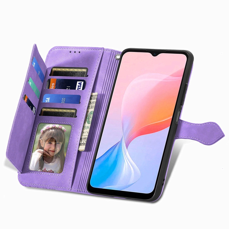Estuche para Teléfono BlackView A85 de Cuero con Cremallera y Flor en Relieve (Púrpura)