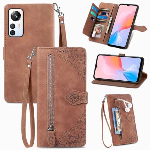 Estuche para Teléfono BlackView A85 de Cuero con Cremallera y Flores en Relieve (Marrón)