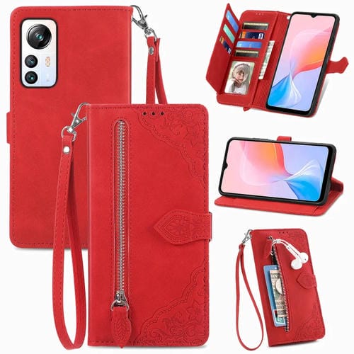 Estuche para Teléfono BlackView A85 Cuero con Cremallera y Flores en Relieve (Rojo)