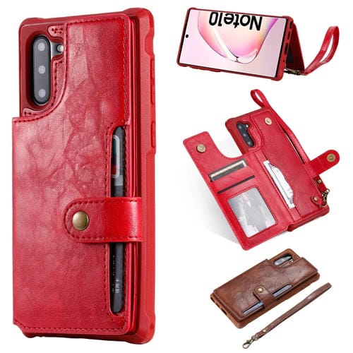 Estuche protector para Galaxy Note 10 con cremallera, hebilla, soporte, ranuras para tarjetas, billetera, cordón y marco de fotos (Rojo)