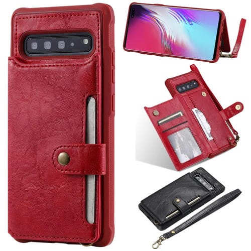 Estuche Protector Galaxy S10 5G con Cremallera Hebilla Soporte Ranuras Tarjetas Billetera Cordón Marco Fotos (Rojo)