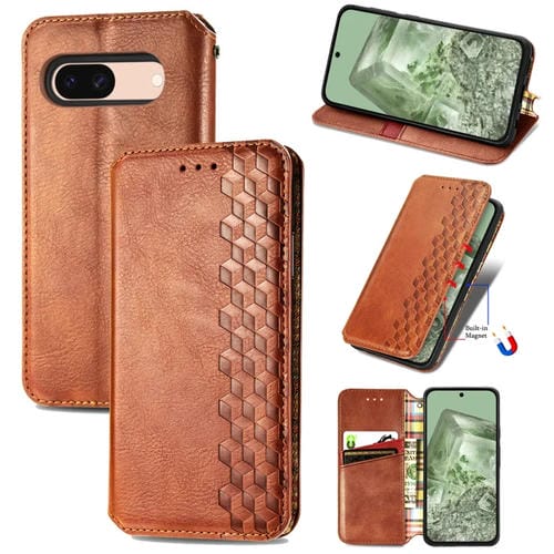Funda de Cuero Magnético Prensado Cubic Grid para Google Pixel 8A (Marrón)