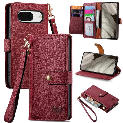 Funda de Cuero para Google Pixel 8A con Love Zipper y Lanyard (Rojo)