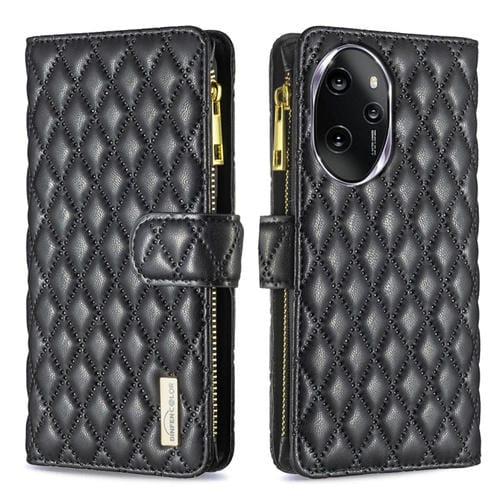 Funda de Cuero para Honor 100 Pro Diamond Lattice Zipper Wallet con Tapa (Negro)