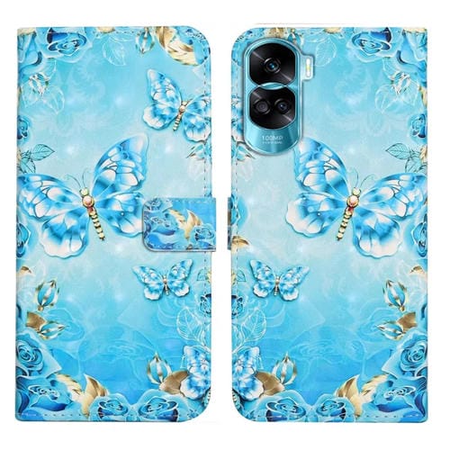 Funda de Cuero para Honor 90 Lite con Dibujo 3D en Relieve al Óleo (Mariposas Azules)