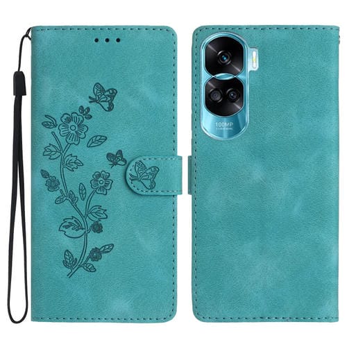 Funda de Cuero para Honor 90 Lite con Estampado de Mariposa y Flores (Azul Cielo)