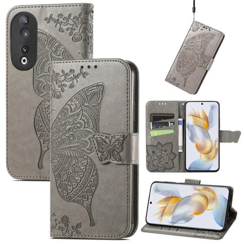 Funda para Honor X9B de Cuero con Relieve Flor de Amor y Mariposa (Gris)