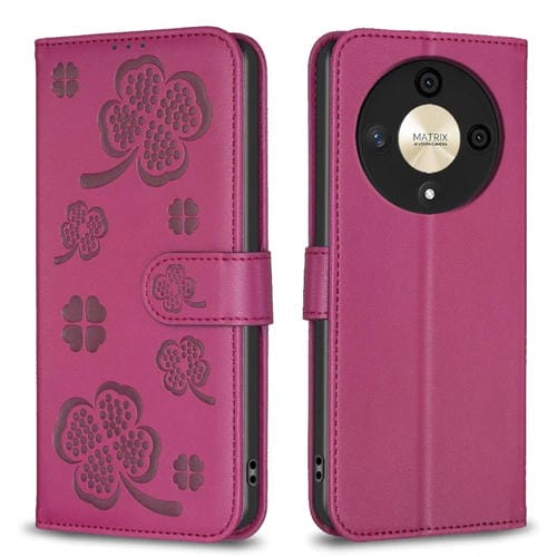 Funda para Honor X9B y Magic6 Lite 5G de Cuero con Relieve de Cuatro Hojas (Rojo Rosa)