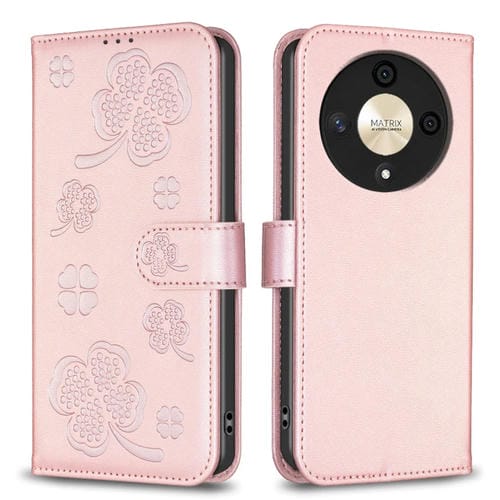 Funda de Cuero para Honor X9B y Magic6 Lite 5G con Relieve de Cuatro Hojas (Rosa)